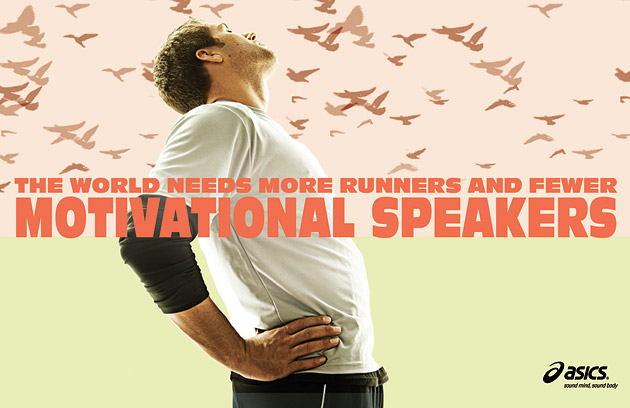 Under the umbrella tagline “Sound Mind, Sound Body,” the Asics running shoe brand has long been positioned as a launch pad for positive energy. In other words, running makes you feel better. These brand print ads were designed to captivate and inspire runners of all skill levels with thoughtful, uplifting headlines and a bold, graphic look.