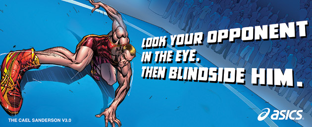 Competitive wrestlers are superheroes to their fans. Much like the characters in comic books. Put the two together and you have a marriage that works especially well in the outdoor space, as you can see in this illustrated billboard for the new Cael Sanderson wrestling shoe.